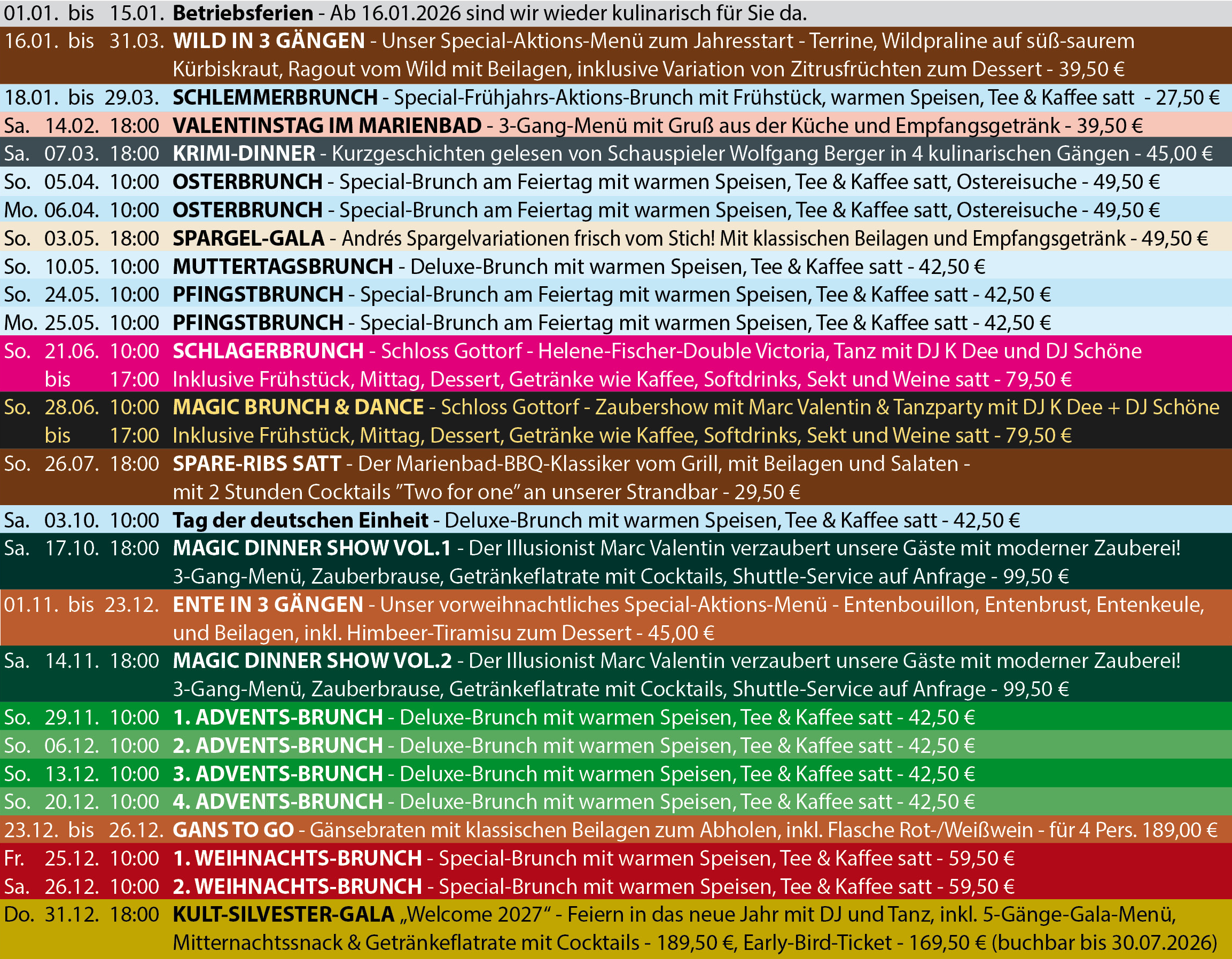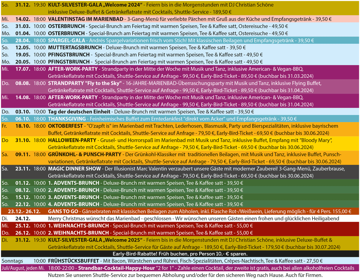 Zuhause bleiben war gestern. Nehmen Sie Teil an unseren beliebten kulinarischen Veranstaltungsklassikern und kulturellen Events wie Konzerten oder Lesungen. Lassen Sie sich verzaubern vom unverwechselbaren „Marienbad-Spirit“ am Ostseefjord-Schlei. Reservieren Sie rechtzeitig und sichern Sie sich die begehrten Plätze.